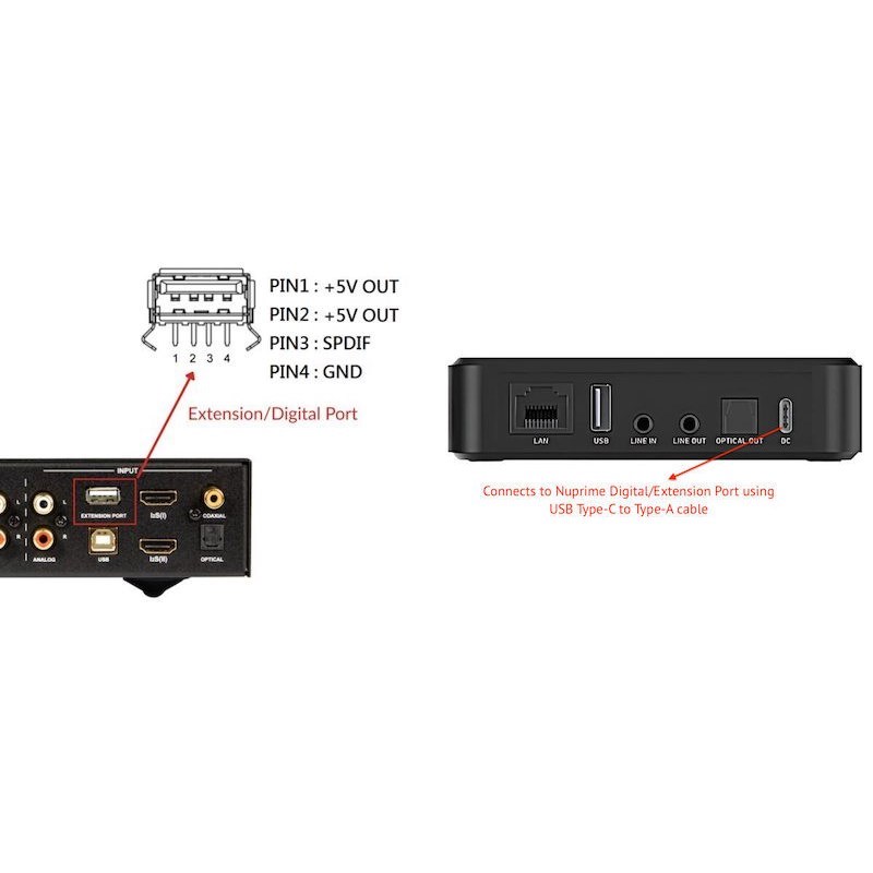 - NuPrime Digitális Port: adat- és tápellátás egyetlen kábelen keresztül NuPrime DAC-okhoz és erősítőkhöz (5V + S/PDIF)